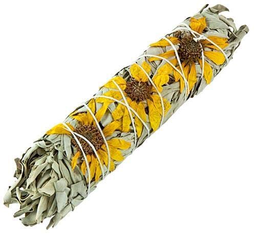 Sunflower flowers combined to a smudge stick – wand with white sage (salvia apiana) Carefully and gently hand-picked leaves and flowers, dried in the California sun. and bundled by hand with respectto detail A summer greeting from California thanks to the bright golden yellow flowers of the sunflower! Packaged aroma-conserving, we do without plastic wherever possible. Also very popular – lavender with white sage – as a fragrant alternative