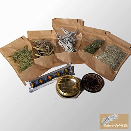 Large Incense-SET: Large selection of finest Incense – Premium Incense Set of natural holy indian white sage, American cedar, Shasta Sage, Sweetgrass, Yerba Santa – together with a censer made of fine brass and a ration fast glowing coal