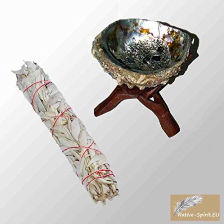 Large Smudge Set [L-WS_A6_T]: White Sage L-Smudge and Huge Abalone Shell 15-18 cm (Abalone Shell 5-6Inch) with Tripod – Salvia Apiana – White SAGE Smudge ML 5-6'' (~ 13-15cm~ 30-35g.)